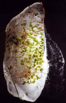 "...Only JIM HAMLYN and ANNETTE HEYER really take risks with the work they made together. We are fully rewarded by this exciting collaborative project. Rather than providing literal images as proof of water, water was collected from different depths and areas across the entire length of the Forth and Clyde Canal, From Glasgow to Edinburgh. Samples were frozen into shapes of discarded objects found nearby, and later allowed to melt away. H & H present a diversity of materials and processes: salt prints, silver prints, colour prints and found objects. Theirs is an eclecticism, no homogenization here, reflecting the flotsam and jetsam of momentary and fragmentary human experience as metaphorically represented by the history of ebb and flow that this canal presents. H & H are stimulating and inventive artists, allowing their work to develop and respond without the burden of preconditions. |