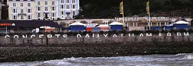 "The painted sign on the pier wall restored by Hamlyn originally served as a notice for the twice-daily concerts in the pier pavillion. First painted in the 1890s, it has faded to little more than a ghostly shadow. In repainting only the top half of the simple block letters, and by so doing avoiding a simple anouncement of the concerts, the work assumes an evocative resonance beyond that normally permitted by the declaritive function of such a sign. Hamlyn's aim in activating a state of multiple-coding within his work - the movement of floating signifiers - puts in jeopardy the notion of a sign which deploys a single, defining statement and allows a simultaneous display of the past and present to become diffused with the poetic associations of the coming ang going of the tide and the amusements (concerts or concepts) that people seek when at the seaside on holiday." Andrew Wilson, (from the catalogue). |
